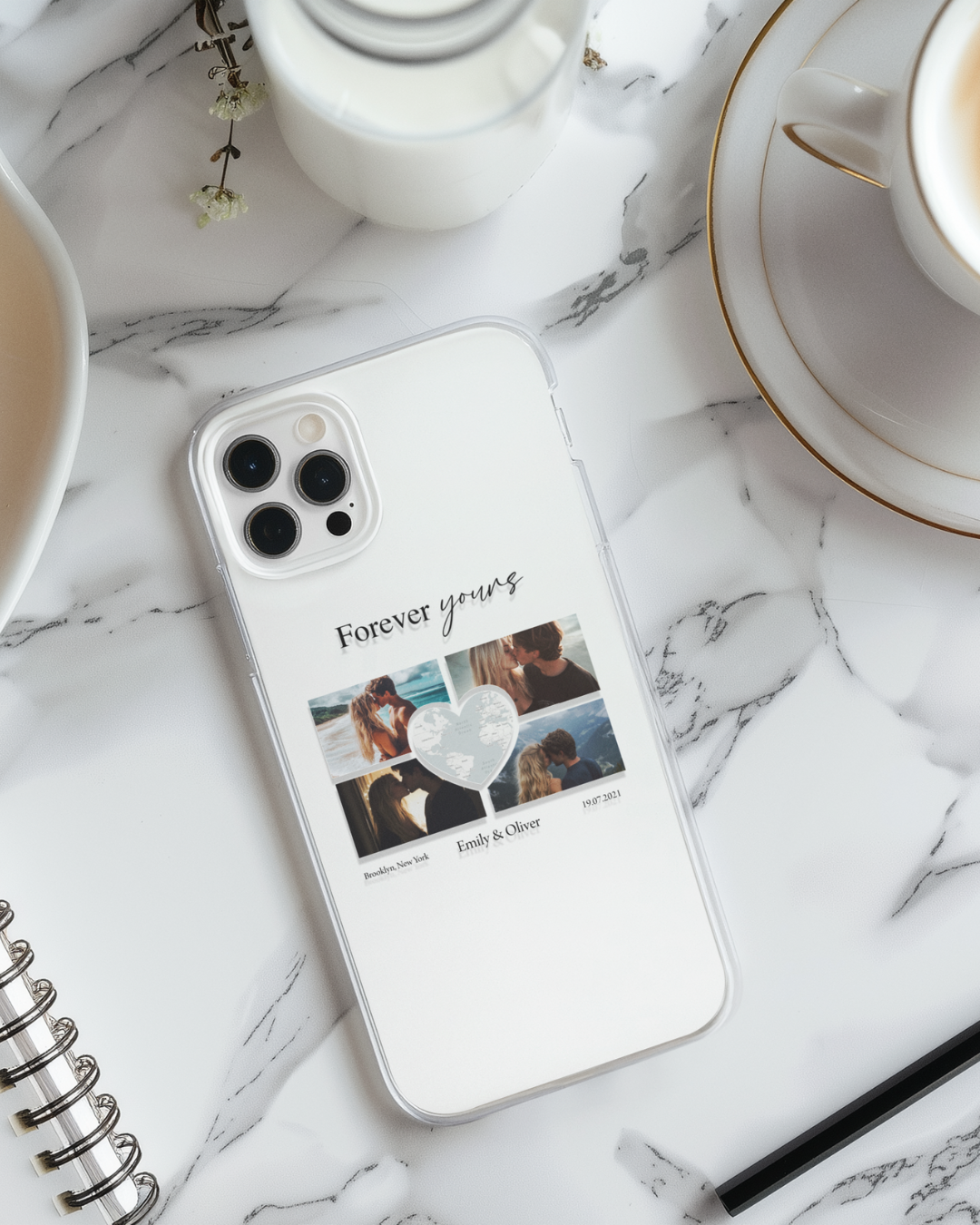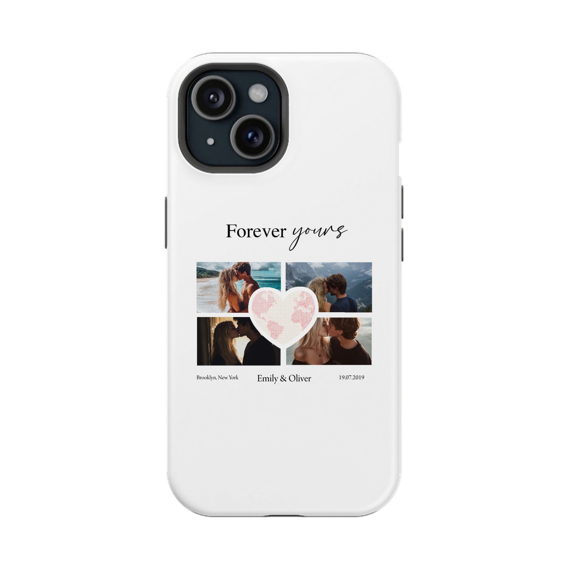 Celebrate your love story with this beautiful personalized print. This elegant design lets you showcase 4 of your favorite photos and includes a heart-shaped map marking a special location – perfect for where you first met, got married, or shared a meaningful moment.