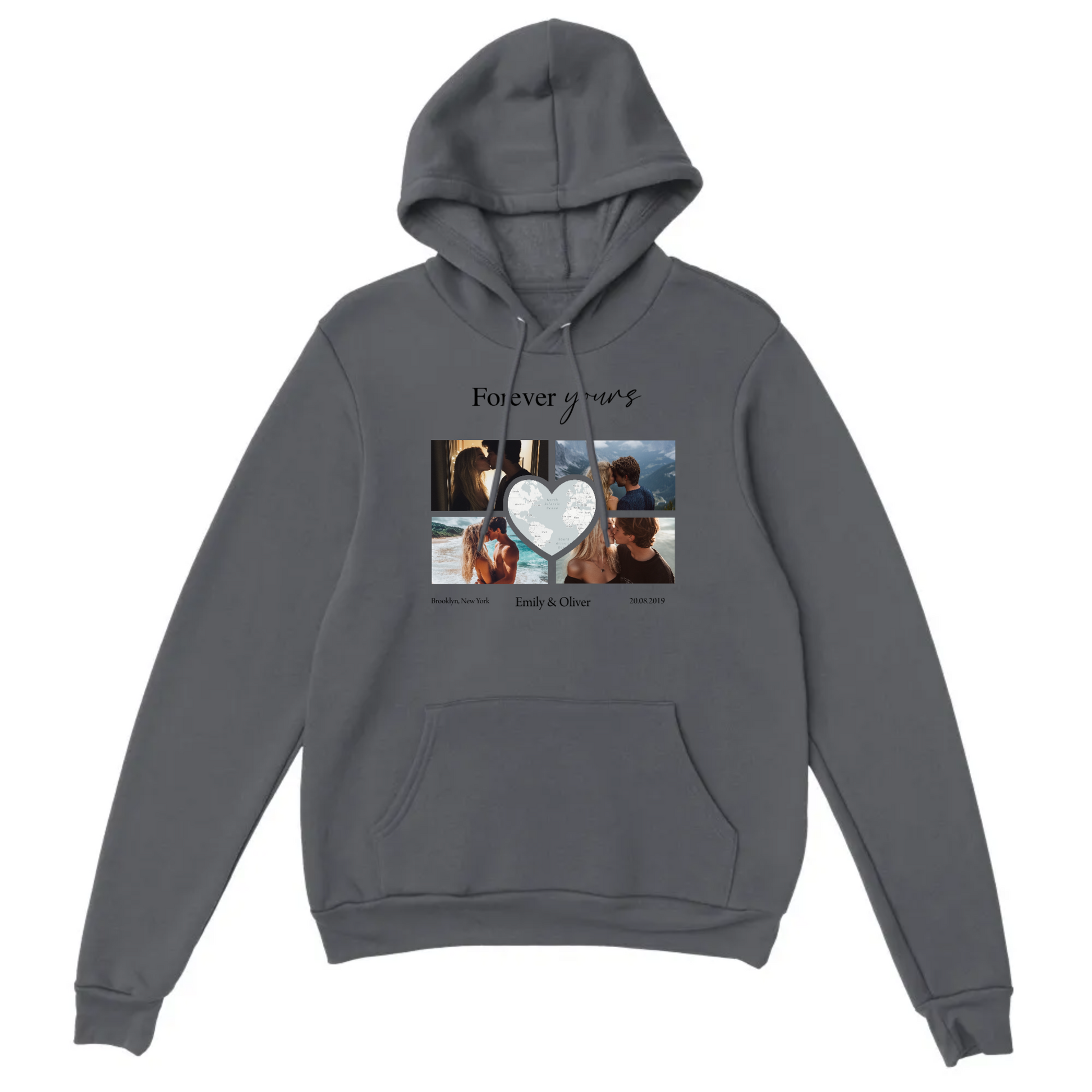 Celebrate your love story with this beautiful personalized print. This elegant design lets you showcase 4 of your favorite photos and includes a heart-shaped map marking a special location – perfect for where you first met, got married, or shared a meaningful moment.